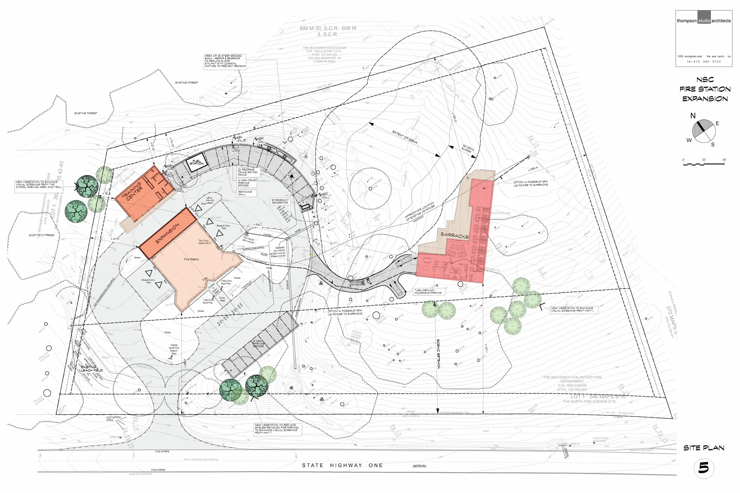The four main pieces of the project are (a) building a new building with living quarters, “up the hill”, (b) expanding the existing station towards the north, the width of one more bay, (c) converting the existing station kitchen and meeting room into office space, and (d) building a separate training center with a large multi-purpose meeting room, small kitchenette, storage and restrooms (much like the Platt Center in Gualala). The image at the top of the page shows a model of the buildings, showing the slope and the trees. The diagram below shows the layout.